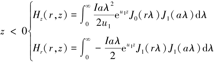 为激发电流强度;J0和J1分别为零阶和一阶贝塞尔函数;λ为贝塞尔函数积分计算过程中的中间变量;ε1为地层的介电系数;σ1为地层的导电率;μ0为真空磁导率[22]。