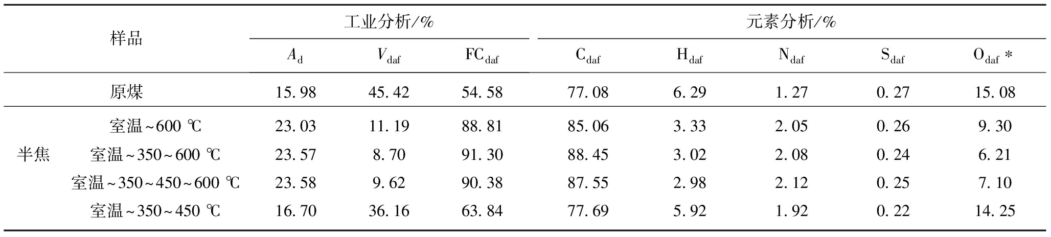 表5给出了原煤及不同热解过程所得半焦的孔结构参数。由表5可知,与原煤相比,350 ℃半焦的比表面积降幅达46.75%,孔体积也呈降低趋势,孔径则增加29.46%,可归因于以氢键等弱键方式与煤大分子结构相结合的小分子逸出,同时发生了孔的合并、扩孔,因而孔径增加。而450 ℃半焦的比表面积比350 ℃半焦的高8.39%,孔径有所下降,这是由于升温过程中产生了新的微孔。