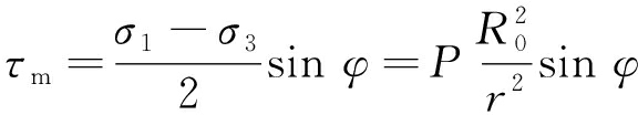 如图2所示,当最大剪应力τm等于极限剪应力τu时,此时围岩处于极限平衡状态莫尔圆与强度包络线相切,相切点与最大主应力夹角为