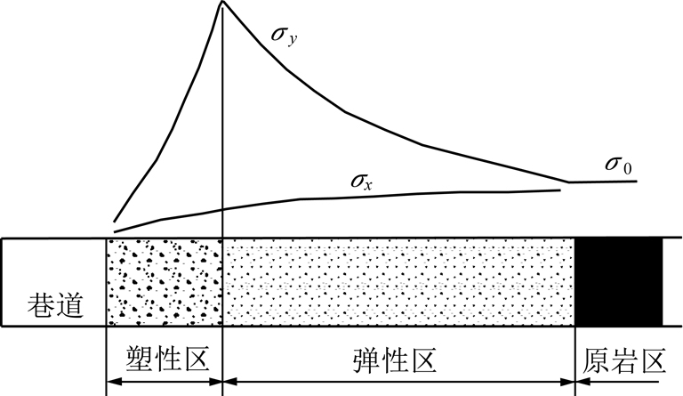 进行巷道开挖工程后,工程结构体形成,由于煤岩体内应力重新分布,上覆岩体的自重应力转移到巷道的两帮,产生了高于原岩应力P0的侧向支承压力