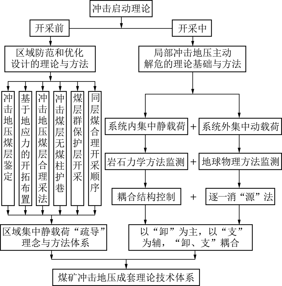 课题组以冲击地压物理演化过程剖析为切入点,以诱发冲击启动载荷源为主线,基于冲击启动理论分别对冲击地压机理、预评价、监测预警、防治等各环节开展了系统性研究,在实践应用基础上建立煤矿冲击地压理论与成套技术体系,如图14所示。