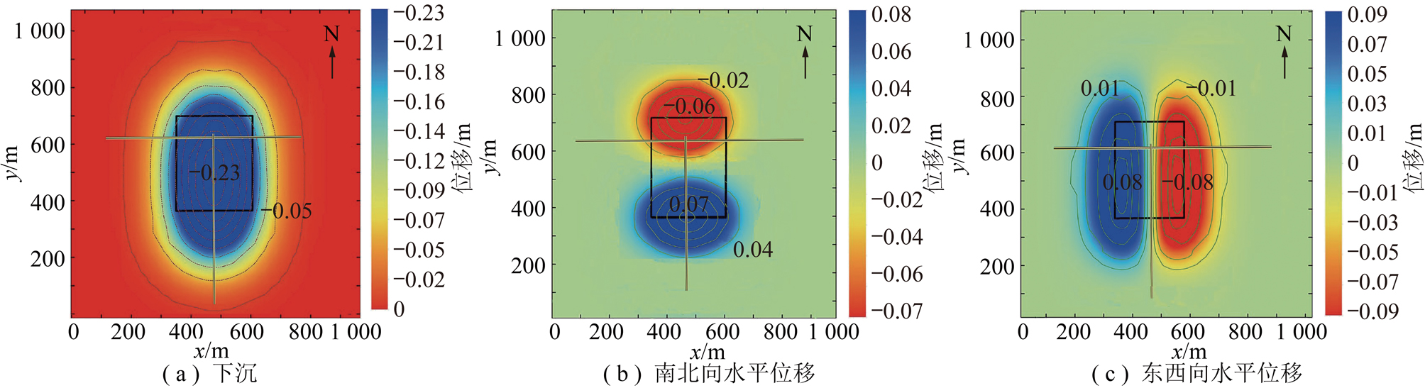 按照动态的三维位移分解模型式(22),(23)对图13的LOS向位移进行三维分解,生成地表下沉、南北向水平位移、东西向水平位移的等值线图,如图14所示。可以看出,工作面推进到340 m时,地表动态下沉、南北(即走向)、东西(即倾向)位移在走向主段面线的两侧都基本呈现对称特征,而在开切眼和推进边界上方地表的下沉和水平位移分布均为不对称状态。应该指出,本例中工作面走向为正南北向,倾向为东西向。如果工作面推进方向与北方向斜交,则应将计算出的南北向、东西向水平位移按照式(15)转换为沿工作面走向和倾向的水平位移后,再绘制走向和倾向水平位移等值线图。