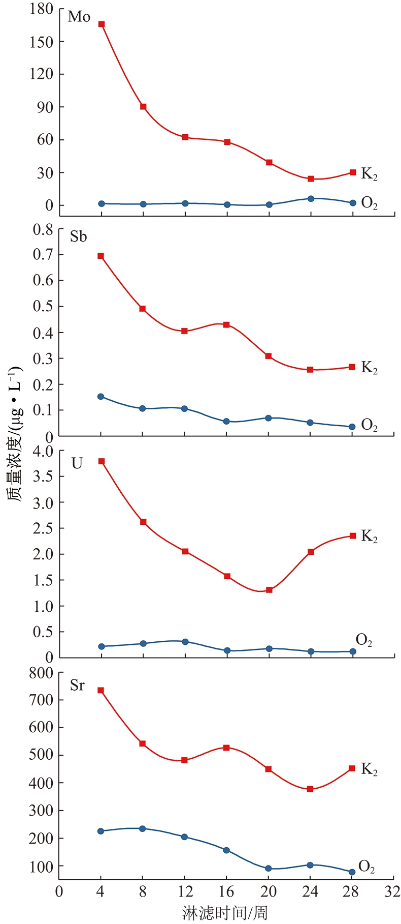 K2和O2灰岩淋滤中Mo,Sb,U和Sr离子含量特征与Fe离子含量分布规律正好相反(图8),K2灰岩淋滤液中的Mo,Sb,U和Sr离子含量均显著高于O2灰岩淋滤。在这4个微量元素中,按照含量高低的顺序依次为Sr>Mo>Sb>U。