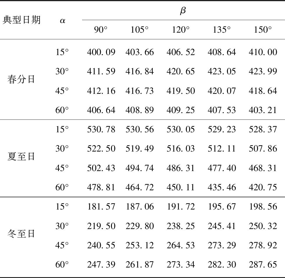 典型日期αβ90°105°120°135°150°15°400.09403.66406.52408.64410.00春分日30°411.59416.84420.65423.05423.9945°412.16416.73419.50420.07418.6460°406.64408.89409.25407.53403.2115°530.78530.56530.05529.23528.37夏至日30°522.50519.49516.03512.11507.8645°502.43494.74486.31477.40468.3160°478.81464.72450.11435.46420.7515°181.57187.06191.72195.67198.56冬至日30°219.50229.80238.25245.41250.3245°240.55253.12264.53273.29278.9260°247.39261.87273.34282.30287.65