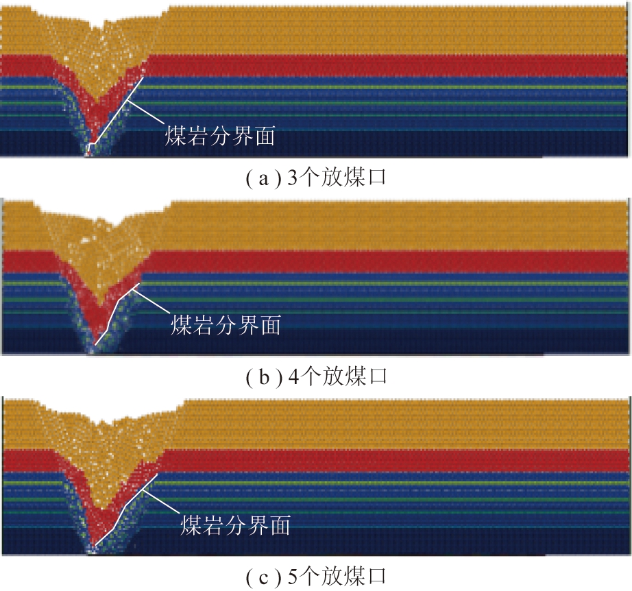 模拟在12.0 m顶煤厚度条件下,同时开启3,4,5个放煤口的多放煤口协同放煤对煤岩分界面形态和顶煤采出率的影响。