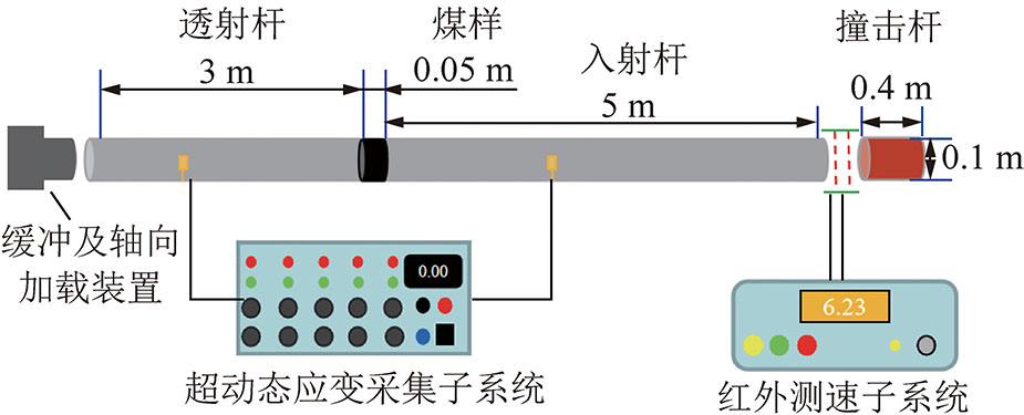 实验采用SHPB实验系统(图4)完成,该系统由动力加载装置、动态应变采集与处理装置组成。动力加载装置由弹室、子弹、入射杆(φ100 mm×5 000 mm)、透射杆(φ100 mm×3 000 mm)组成,压杆材料选用30Crmosini2a钢材制作,弹性模量为210 GPa,弹性波速度为5 100 m/s。待测试样置于入射杆与透射杆之间,腔室内子弹在高压气体推动下高速撞击入射杆,从而在入射杆与子弹接触界面形成压缩应力波。入射杆内一部分应力波在压杆与试样接触面发生反射,另一部分穿透试样进入透射杆。入射杆与透射杆均会在应力波作用下发生变形,粘贴在入射杆和透射杆表面的应变片会记录到轴向应变信息,应变片记录的脉冲信号由动态应变采集仪存储。