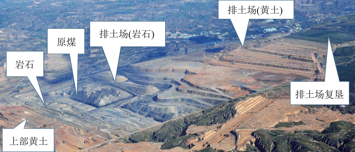 以黑岱沟露天矿边采边复(采复一体化)为案例。黑岱沟露天矿位于晋、陕、蒙接壤的黄土丘陵地区,水土流失十分严重,自然生态环境恶劣,以旱作农业为主的农牧业结合区。黑岱沟露天煤矿1990年开始建设,2002年达产。为使生态环境不遭受严重的破坏,在生产的同时进行土地复垦及生态重建,黑岱沟露天矿自2002年底实现内排。采剥工艺为:上部黄土采用轮斗挖掘机-带式输送机-排土机的连续开采工艺;下部黄土及上部岩石采用单斗—卡车开采工艺;下部40 m左右的岩石采用抛掷爆破—拉斗铲倒堆开采工艺[23];排弃时按照原来的地层结构依次排放,即拉斗铲倒堆的煤层以上40 m左右岩石排弃至最下方,在上面排弃单斗-卡车开采的下部黄土及上部岩石,最上面排弃轮斗挖掘机-带式输送机-排土机开采的黄土,为了保证复垦工程的正常进行,所有排土场尽快达到设计标高,以保证复垦工程与排土工程同步实施,对排弃后的表土及时开展复垦工作(图5,图片来源:https://www.zhihu.com/question/47635928/answer/107161604)。由于采矿剥离形成了排土场较陡、较长的斜坡及平盘,所以需先进行地表整形,地形设计既要对已形成的排土场不作大规模改变,又要满足生物复垦的要求。覆土后再进行整形,具体做法是:平盘整治成水平小区,使之地面小平大不平,其间修筑隔离堤,坡地开挖排水沟,做到小雨不外流,大雨可截流疏排;对于已形成土少石多的台阶坡面,考虑到覆土后易形成坡面泥石流,导致已恢复的植被被毁坏,故不覆土,可采用客土栽植“活篱笆”(密植的灌木或多年草本植物)防止水土流失。
