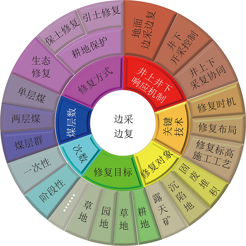 煤矿对中国的贡献和影响巨大,长时期、高强度、大规模的煤炭资源开发对区域生态环境产生深远影响,边采边复实际上是一种基于采前分析-采矿动态损毁预测-修复模拟的多阶段多参数驱动的修复方案优选技术。露天煤矿的边采边复,即“采复一体化”,已经得到国际上广泛认可和实施,如1977年《美国采矿管理与复垦法》(Surface Mining Control and Reclamation Act)第102款“目的陈述”中的(e)条中,明确规定露天煤矿要尽可能同步复垦(assure that adequate procedures are undertaken to reclaim surface areas as contemporaneously as possible with the surface coal mining operations)。与其他主要产煤国不同的是我国85%以上的煤炭产量来自井工开采,我国大量的研究都将采煤沉陷地作为重点,因此,边采边复的基本原理是基于煤炭资源所在区域地形地貌、水文地质、植被覆盖度等自然条件以及煤炭资源赋存条件,因地制宜地考虑矿区环境修复与采矿过程的耦合、地表与地下的耦合。比如,对于井工矿山来说,边采边复的关键在于明确井上下的耦合关系,即对井下开采与地面沉陷的机理进行研究,对沉陷的时空发展规律及与环境的损伤程度关系进行情景模拟与分析,核心技术在于解决“何时修复”、“何地修复”、“如何修复”这3个问题。而这3个问题中最重要也是最难解决的即是“何时修复”。而对于露天矿山来说,边采边复的核心在于科学与合理安排上覆土体与岩层剥离空间位置与时间,优化内外排土场的布局,在保证正常采矿作业的前提下,实现剥离与修复的同步进行,减少土地压占与占用时间。