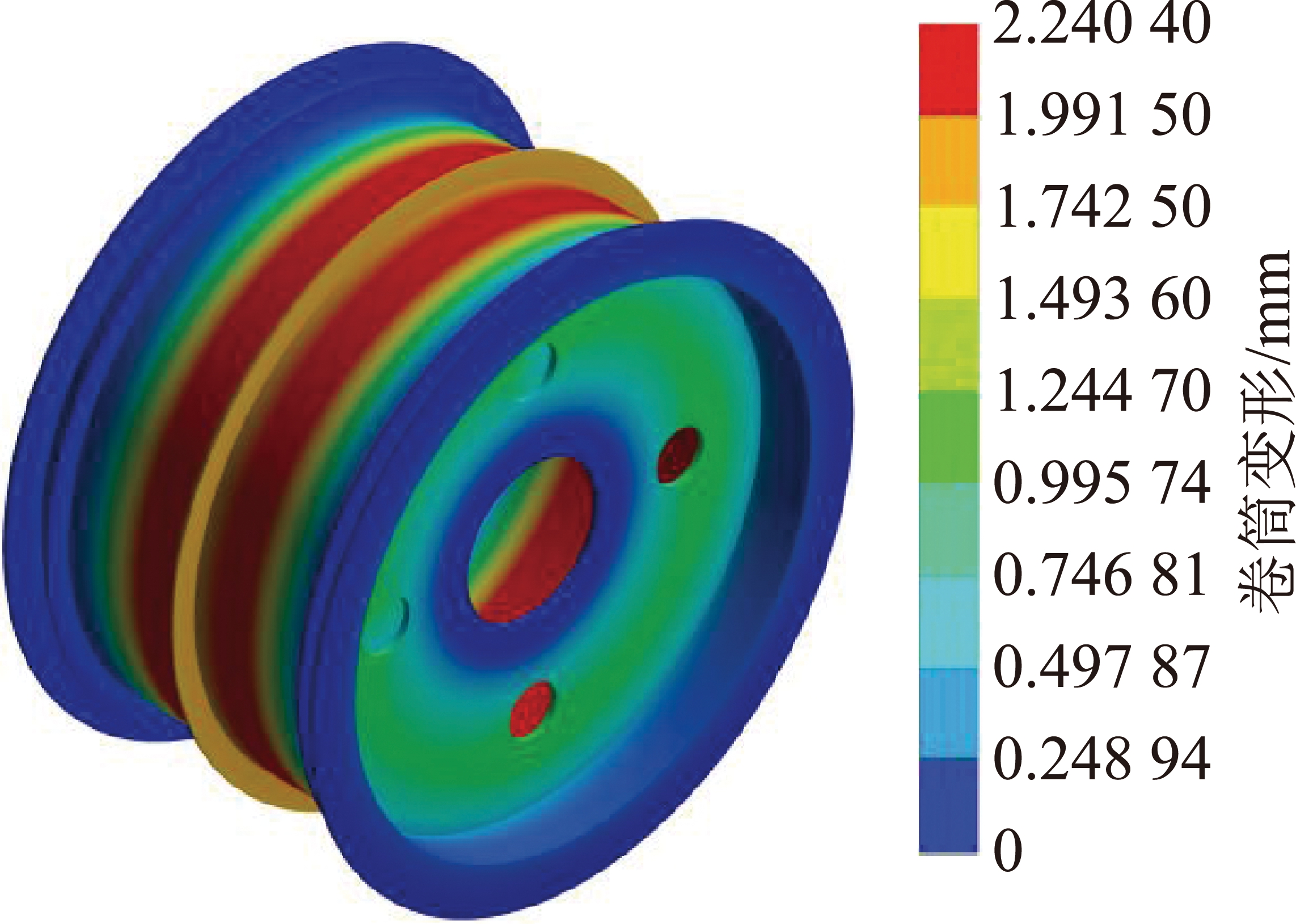 为验证卷筒受力产生变形的计算正确性,将数值分析时得到的4种工况下钢丝绳张力差最低的卷筒结构(右左出绳方式,左、右轮孔距均为4个绳槽节距,如图8所示,缠绕过程中钢丝绳最大张力差0.002%)进行三维建模,并导入Workbench中使用Static Structural模块进行有限元分析。材料定义为Q345,弹性模量206 GPa,泊松比0.3,采用自动划分网格方法,尺寸大小为100 mm,节点数447 379,单元数49 289,在两支轮内径面添加Cylindrical Support约束。如图9所示,将卷筒两缠绳区以绳槽节距进行切割,对每一圈添加周向压力模拟钢丝绳对卷筒的缠绕,设定求解步数为59,模拟钢丝绳对卷筒的59圈缠绕。有限元计算结果如图10所示,卷筒最大变形为2.240 4 mm,两缠绳区变形量呈对称规律。