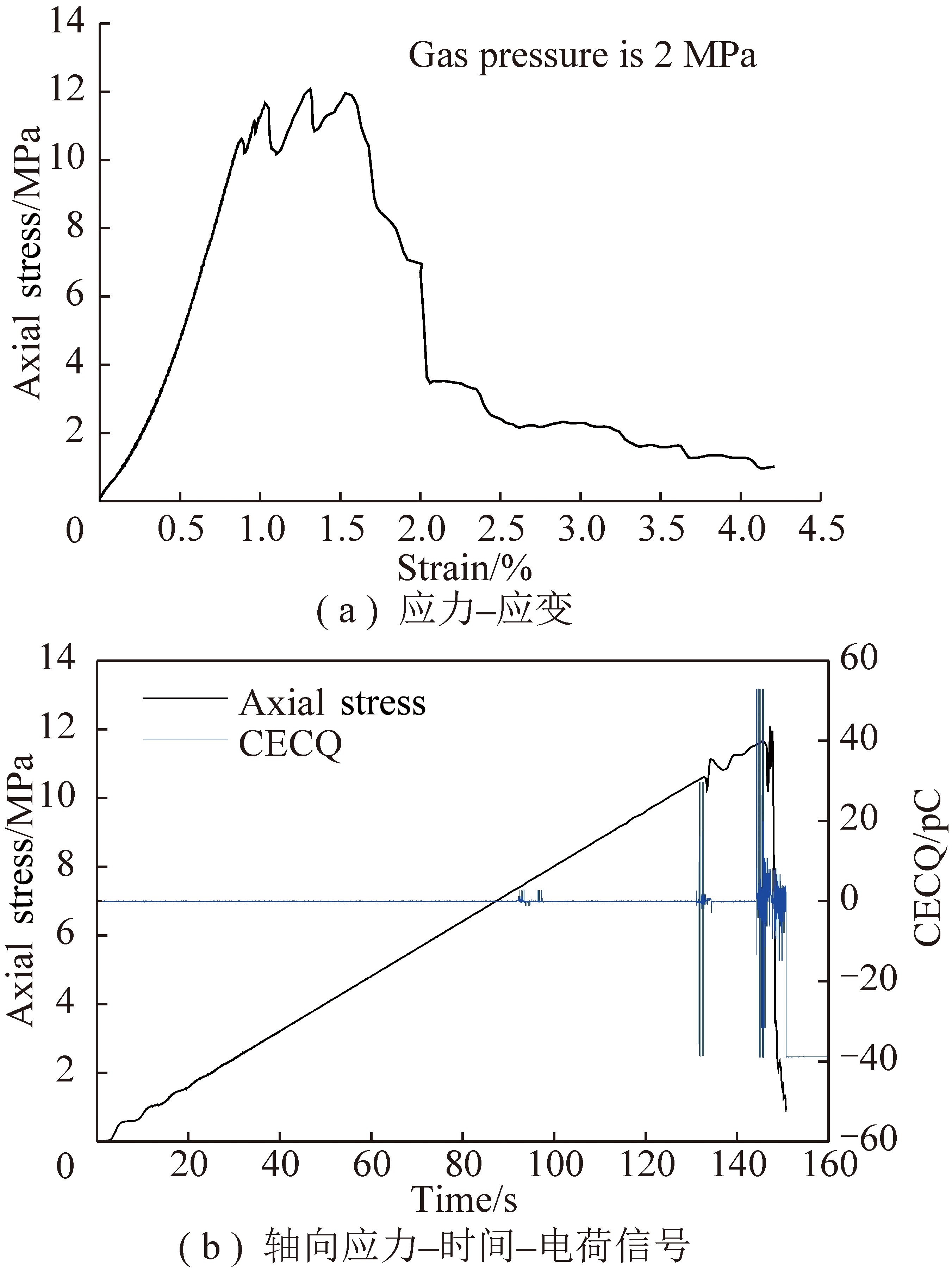 如图9所示,当瓦斯压力为2 MPa时,煤体极限强度降低为12.1 MPa,瓦斯压力以体积力的形式作用于煤体,临近极限强度附近煤体应力-应变曲线表现出明显的屈服特性。煤体弹性变形阶段,当应力达到极限强度62.1%时,应力无变形变化,电荷信号表现两次较小波动。临界峰值强度,由于瓦斯存在,煤体屈服特性显著,该过程电荷信号表现为脉冲簇现象,信号峰值为38.4 pC。峰值强度后,煤体应力迅速跌落,电荷信号发生剧烈震荡,信号峰值达到52.9 pC,小于1 MPa瓦斯压力作用的煤体电荷信号。