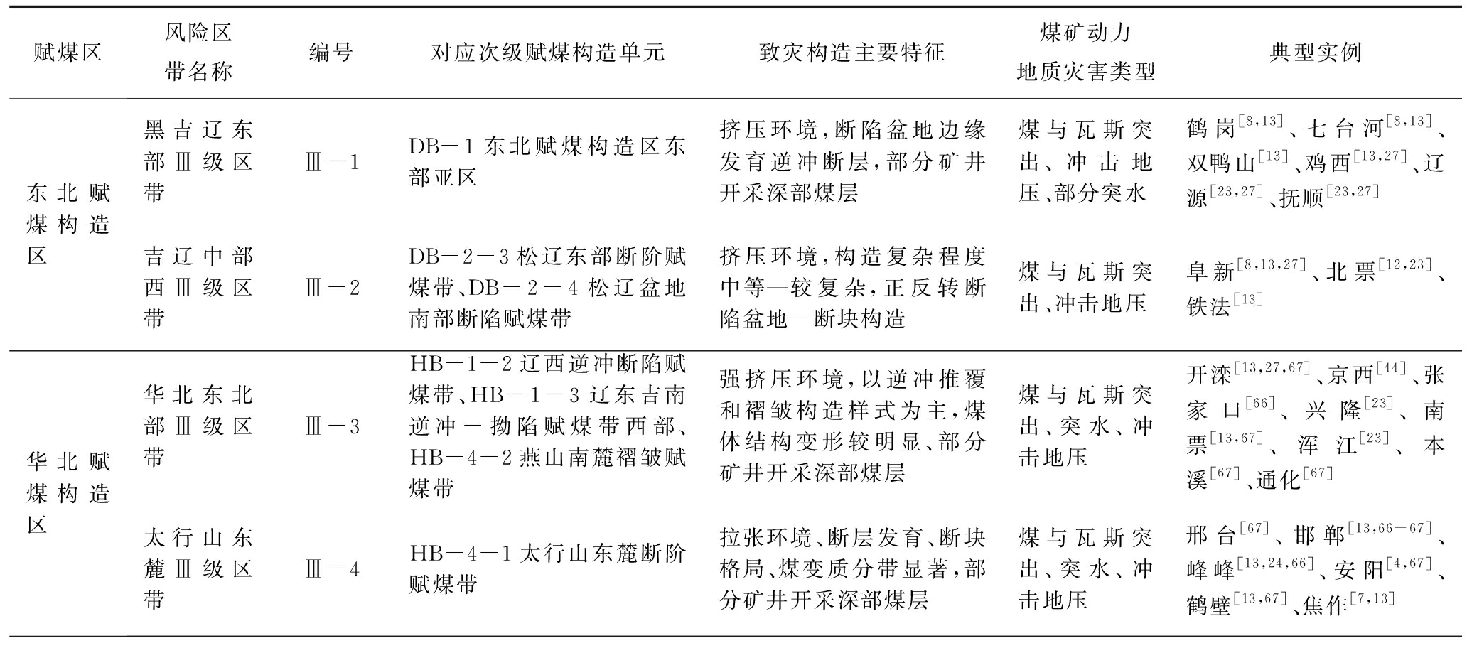 (3)从中国煤田构造格局的时空差异性出发,以各类构造因素对煤矿动力地质灾害的控制作用为依据,在赋煤构造单元框架内进行煤矿主要动力地质灾害风险区带划分。根据致灾构造因素和动力地质灾害特征,将煤矿动力地质灾害风险区带划分为Ⅰ级(低风险)、Ⅱ级(中风险)和Ⅲ级(高风险)等3个等级。东北、华北、华南和西北4大赋煤构造区共划分煤矿动力地质灾害Ⅲ级区带11个、Ⅱ级区带7个,其余地区属于Ⅰ级区带或未评价区域。