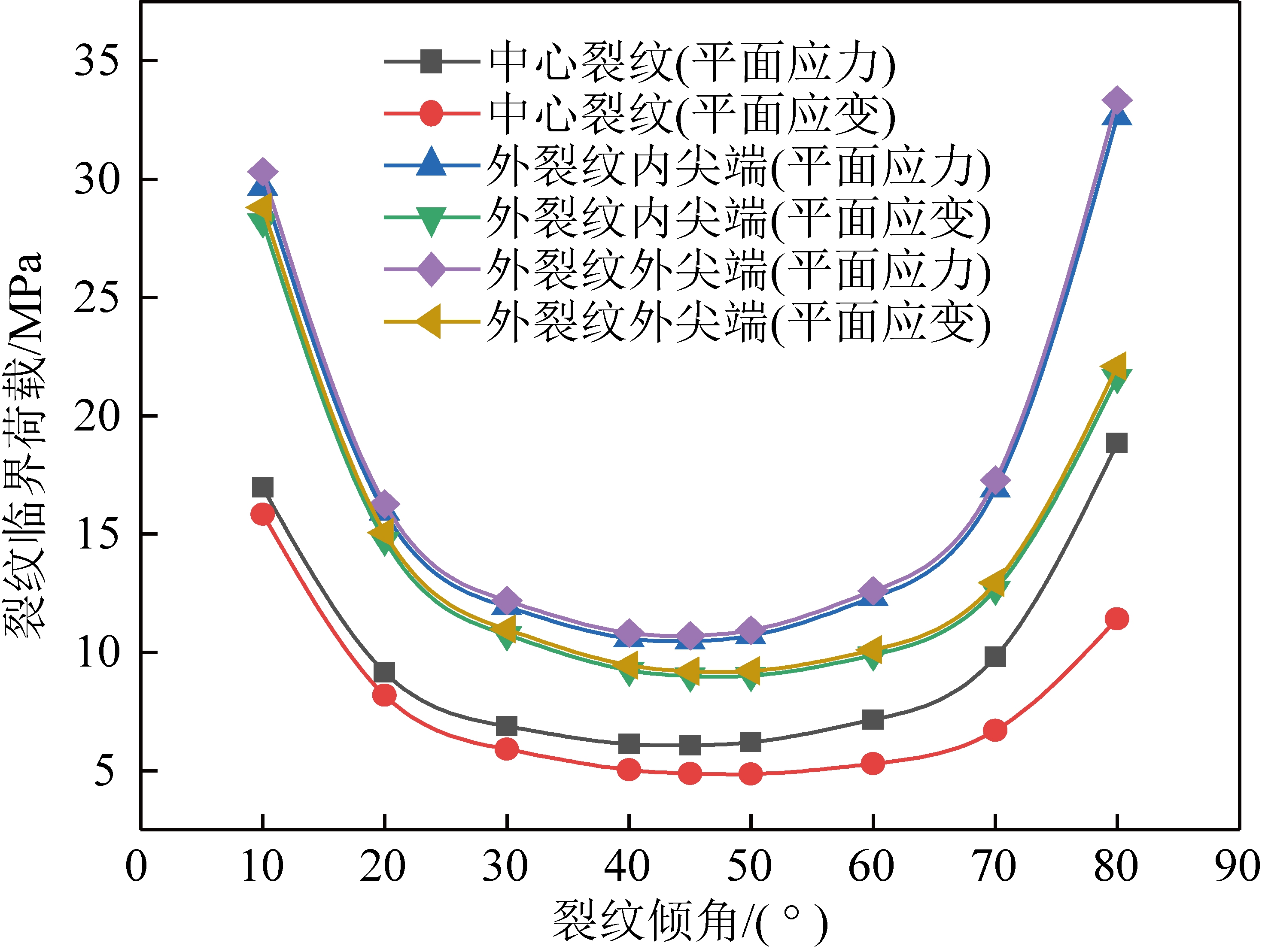 要计算裂纹起裂荷载还需知道裂纹的断裂韧度、裂纹面摩擦因数和裂纹面闭合度等相关参数,由于该文献中没有测量数据,本文以常见的参数取值范围为标准,参考文献[28]假设断裂韧度KⅠc=KⅡc=2 MN/m3/2,裂纹面摩擦因数f=0.5,裂纹面闭合度η=1,裂纹断裂选择最小塑性区半径准则。
