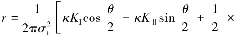 从物理概念来说,裂纹尖端塑性区是一个高度紧张的区域,裂纹尖端必须通过这个高应变区域传播,才能到达核外的弹性加载区。最小塑性区半径准则[22]认为裂纹沿着裂纹尖端到塑性区边界的最小半径方向起裂,在此方向上,产生新裂纹面所需的塑性功最小,也就是所需的断裂能最小。为了考虑裂纹尖端塑性区的影响,这里基于最小塑性区半径准则求解裂纹的起裂角及起裂荷载。