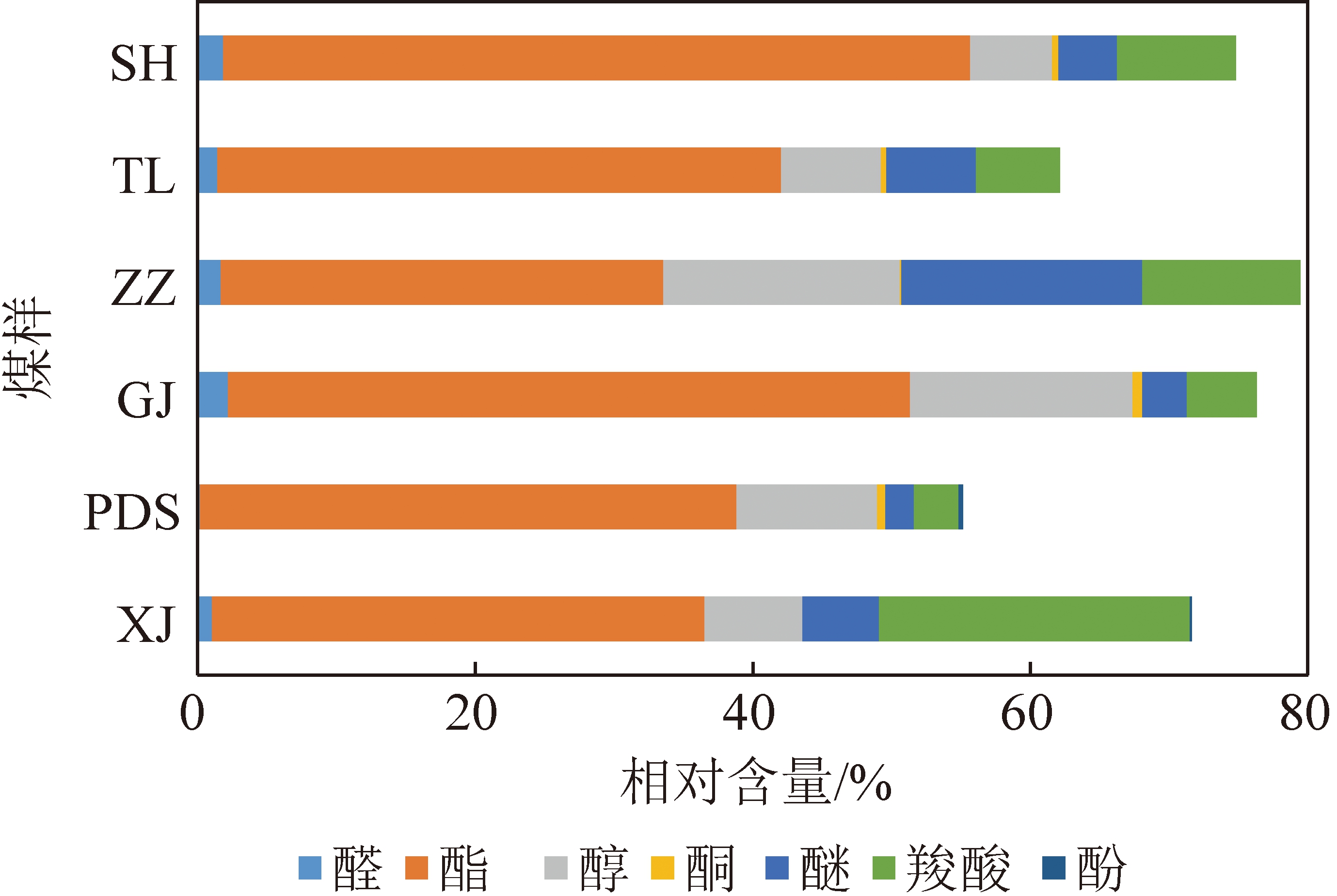 随着煤变质程度的加深,萃取物中有机化合物种类为先增多后减少的趋势(图4)。其中杂原子化合物相对含量均大于50%,且主要为含氧杂原子化合物。含氧杂原子化合物中酯类相对含量最高,其次为醇类和醚类(图5)。其中,低变质的长焰煤(XJ)中羧基相对含量高,而高变质的贫瘦煤(ZZ)、贫煤(TL)、无烟煤(SH)中醛类为主。随着煤化程度的提高,醇类和醚类相对含量增加后又迅速减少,依次为7.05→10.17→16.05→17.01→7.19→5.93,5.50→3.20→3.21→17.35→6.47→4.24。