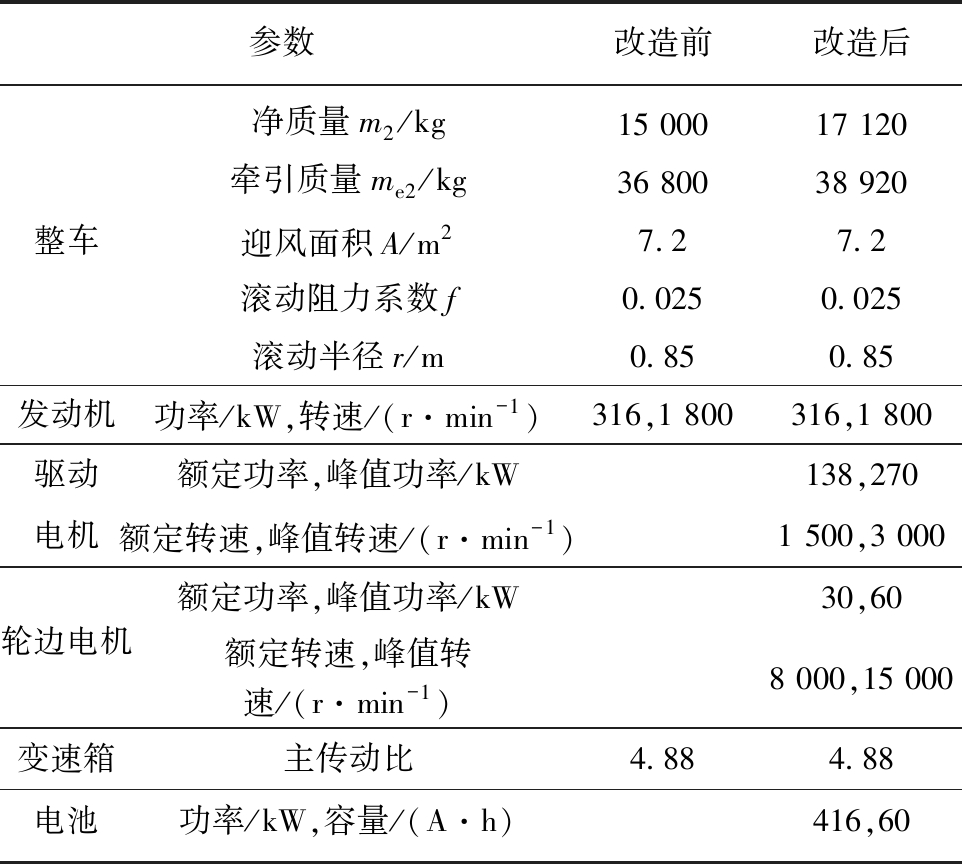 参数改造前改造后净质量m2/kg15 00017 120牵引质量me2/kg36 80038 920整车迎风面积A/m27.27.2滚动阻力系数f0.0250.025滚动半径r/m0.850.85发动机功率/kW,转速/(r·min-1)316,1 800316,1 800驱动额定功率,峰值功率/kW138,270电机额定转速,峰值转速/(r·min-1)1 500,3 000轮边电机额定功率,峰值功率/kW30,60额定转速,峰值转速/(r·min-1)8 000,15 000变速箱主传动比4.884.88电池功率/kW,容量/(A·h)416,60