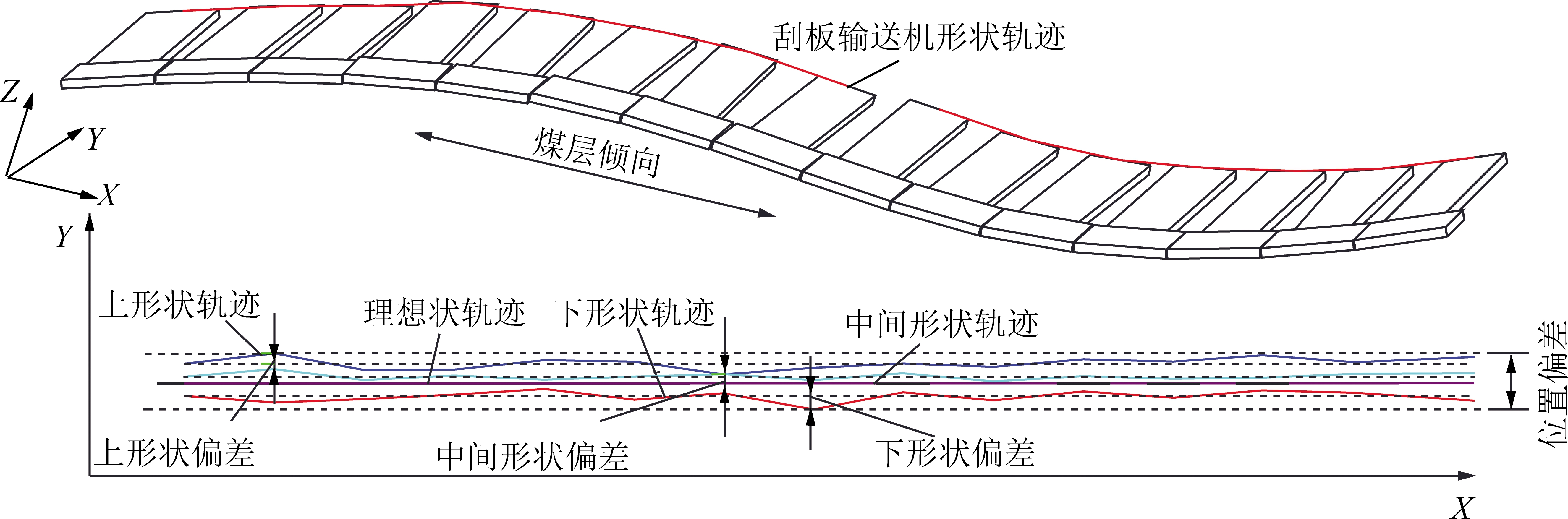 如图2所示,垂直于煤层倾向方向,刮板输送机在XY平面有3种可能的形状轨迹(不包括理想形状轨迹)。形状偏差是指各形状轨迹上的点与其第1个点的位置偏差;位置偏差是指刮板输送机形状轨迹允许波动的最大位置范围;理想形状轨迹是指在垂直于煤层倾向方向上刮板输送机不受任何因素影响、自适应铺设在煤层上、轨迹不存在任何波动时的形状轨迹;上形状轨迹是指刮板输送机形状轨迹超前于理想形状轨迹时的情况,对应的形状偏差为上形状偏差;下形状轨迹是指刮板输送机滞后于理想形状轨迹时的情况,对应的形状偏差为下形状偏差;中间形状轨迹是指介于上形状轨迹与下形状轨迹之间的轨迹,对应的形状偏差为中间形状偏差。
