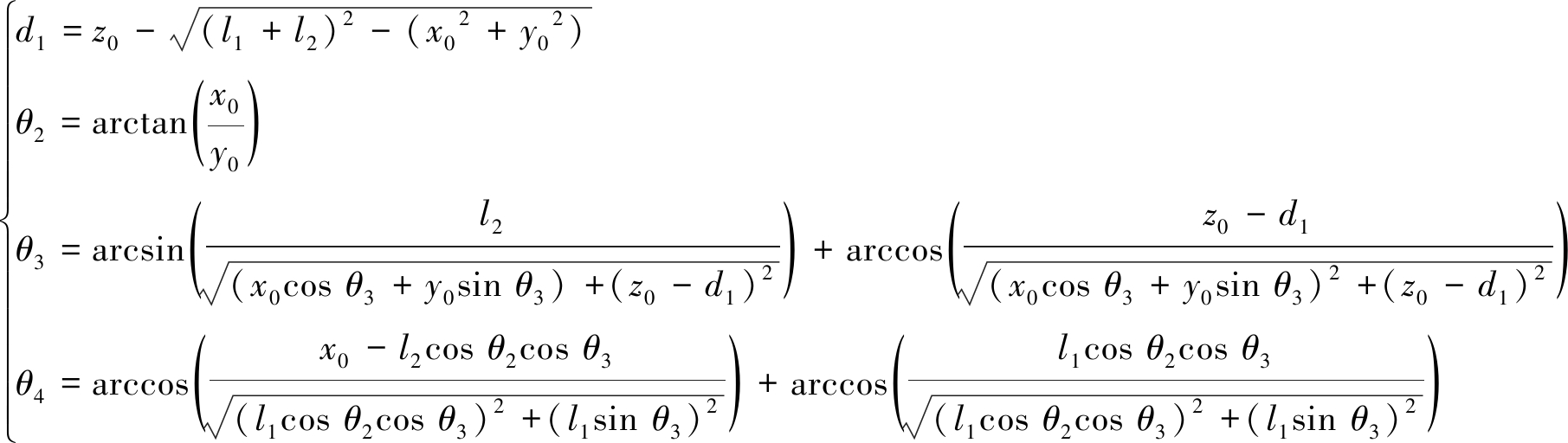 根据0T5=0T1·1T2·2T3·3T4·4T5,建立机械手模型的正向运动矩阵,继而采用逆向运动学技术,对各运动参数进行求解[20],即