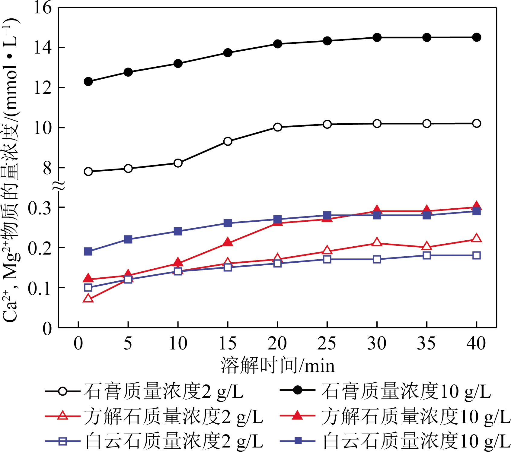 由以上介绍可知,无机盐类矿物的溶解效果是影响循环煤泥水中总离子质量浓度的主要因素之一。在室温、振荡速度120 r/min条件下,石膏、方解石和白云石3种无机盐类矿物的溶解实验结果如图3所示。下面根据3种无机盐类矿物的溶解效果进行对比分析。由图3可以看出,3种矿物在水中的溶解性能存在差异。同一物质的量浓度的3种矿物在水中的Ca2+,Mg2+物质的量浓度均随溶解时间的增加呈先增加后趋于平衡的变化趋势,溶解30 min后3种矿物溶解中的钙镁离子物质的量浓度基本不变,即溶解反应达到平衡状态,此时石膏、方解石和白云石溶液(质量浓度10 g/L)的Ca2+,Mg2+物质的量浓度分别为14.50,0.29和0.28 mmol/L,石膏溶解平衡时的Ca2+和Mg2+物质的量浓度远大于方解石和白云石,研究表明,当原煤中钙镁盐类矿物含量较多时,循环煤泥水系统的水质硬度会提高,而水质硬度作为水化学性质的重要参数,对煤泥水沉降效果起到决定性作用[20-21]。综上所述,煤中矿物的溶解反应是循环煤泥水的离子浓度和水质硬度增加的关键因素。