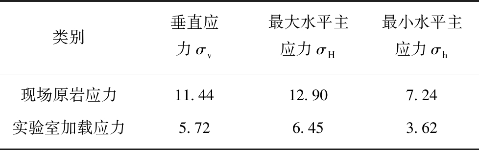 类别垂直应力σv最大水平主应力σH最小水平主应力σh现场原岩应力11.4412.907.24实验室加载应力5.726.453.62