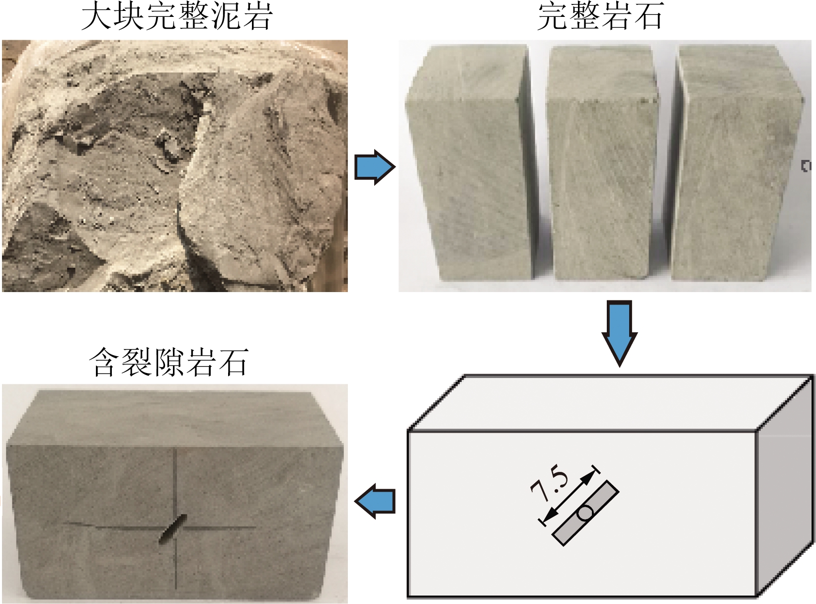 试验所用的试样采自中国西部鄂尔多斯地区中生代侏罗纪-白垩系地层的泥岩,分为完整和含裂隙岩石2组试样。该泥岩呈灰色,层理不发育,质偏软,结构致密但胶结性差,遇水或潮湿空气后极易崩解。如图3所示,从现场采集到的大块完整无节理的泥岩体上进行切割加工制取岩样。试样为长方体,尺寸为25 mm×25 mm×50 mm,岩样尺寸的加工误差不超过±0.5 mm。对切割获得的试样表面采用磨石机进行仔细研磨,使其表面光滑平整且每组对面相互平行,由此获得完整岩石。在制备好的完整长方体试样的基础上,利用线锯方法人工预制一条长度为7.5 mm,宽度为2 mm的贯通裂隙,裂隙倾角为45°,由此制成含裂隙岩石。