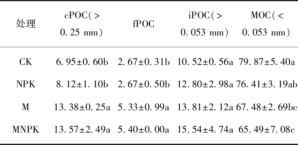 注:cPOC为未受保护的粗颗粒有机碳;fPOC为未受保护的细颗粒有机碳;iPOC为受物理保护的大团聚体中微团聚体内颗粒有机碳;MOC为受化学或生物化学保护的矿质结合态有机碳,是由s+c_m和s+c_f混合而成,下同。同列数据后不同小写字母代表相同组分中不同处理间差异显著(P < 0.05)。