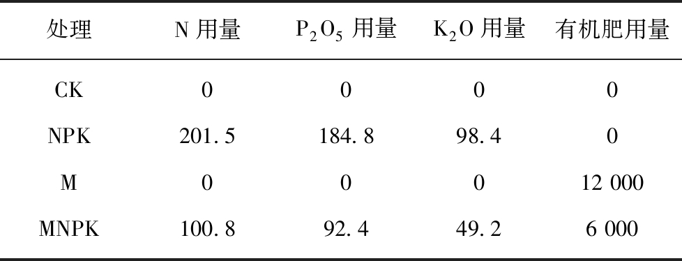 处理N用量P2O5用量K2O用量有机肥用量CK0000NPK201.5184.898.40M00012 000MNPK100.892.449.26 000