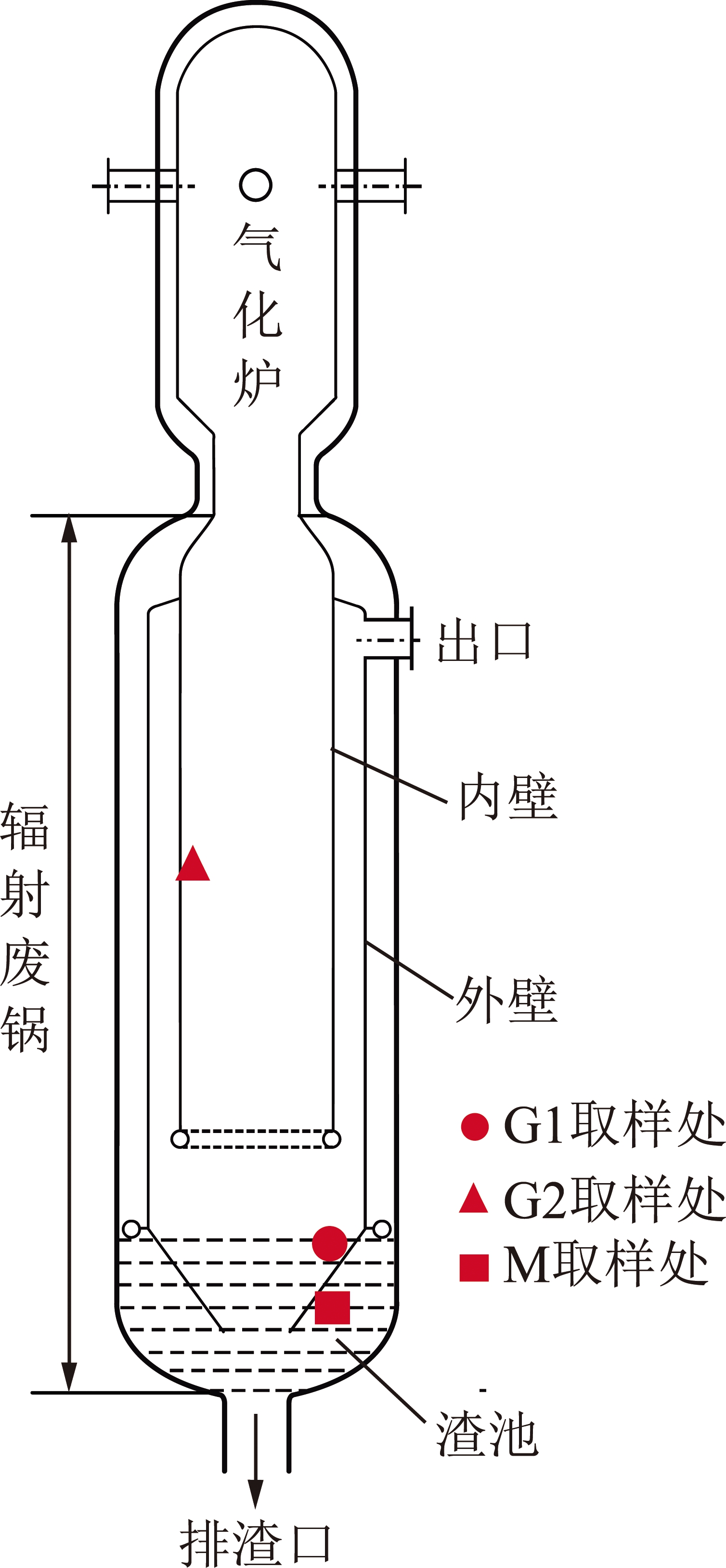 现场渣样取自宁夏煤业公司甲醇厂GE废锅流程气化装置中的辐射废锅,分别是在停炉检修期间从辐射废锅水冷壁底部(标记为G1)和壁面(标记为G2,同种类型的渣标记为G2-1,G2-2)获得的大块渣样。为取得更多渣样进行对比实验,增加数据可信度,并探究不同成渣温度对渣各类参数的影响,本文对飞灰进行烧结实验得到飞灰烧结渣。飞灰原料取自辐射废锅底部渣池处。烧结渣样的制备方法是将飞灰原料颗粒放入圆柱形刚玉坩埚中手工填实,在恒温温度(900~1 200 ℃)的马弗炉中焙烧0.5 h成型(标记为M,不同温度下的渣样记为M-900,M-1000,M-1100等)。取样点位置示意如图1所示,渣样形状和尺寸如图2所示。