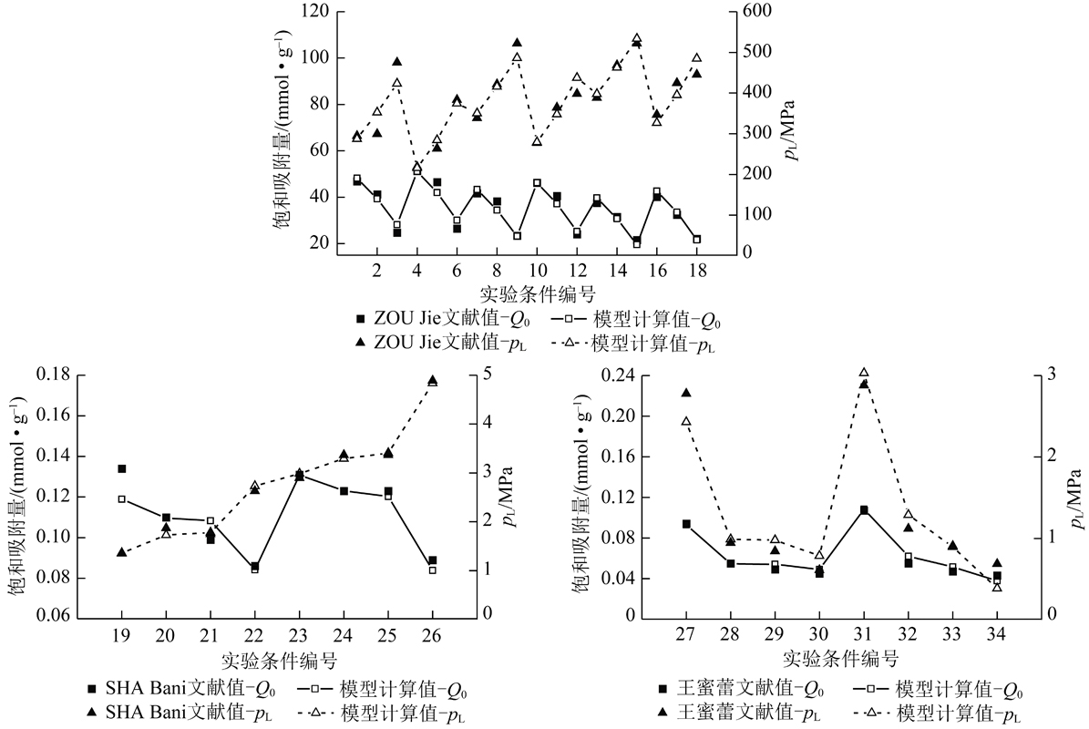 前人的研究发现Langmuir模型可以描述大多数页岩的吸附特征。GASPARIK等[20]应用Langmuir吸附模型对来自荷兰的页岩吸附数据进行拟合分析,拟合误差很小。WENIGER[14]采用Langmuir吸附模型对甲烷在页岩上的吸附进行了拟合,并分析了矿物组成对饱和吸附量的影响。现有页岩气吸附模型的研究多为经典模型的修正和整合,如适用于混合气体吸附的Extended-Langmuir模型、考虑黏土和干酪根吸附差异的双Langmuir模型和DA-Langmuir模型等[21-22],而考虑多因素影响的吸附模型研究较少。梁彬等基于Langmuir模型建立了考虑温度影响的页岩气吸附模型[23]。LU等[24]基于Langmuir模型建立了考虑温度变化的Bi-Langmuir模型,该模型与页岩气吸附实验吻合较好。
