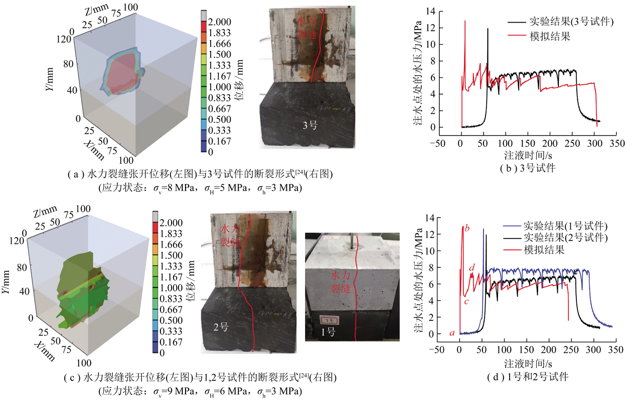 需要注意的是,水力压裂实验所得的水压力-时间曲线,其起裂时刻(b点)滞后于数值模拟结果。这是因为实验所用的试件为干燥条件,而数值模拟假设试件为水饱和的。因此,在模拟过程中,一旦在压裂段注水,压裂段及其附近区域在瞬间产生由水压力引起的附加应力;而在实验过程中,只有当压裂段周围水泥逐渐饱和之后才会有较大的附加应力响应。