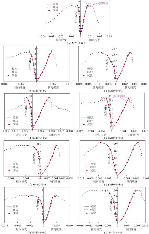 本文提出的非线性本构模型基于有限变形(大变形)理论框架,突破了经典柯西应变的假设。由图9试验数据与模型计算的对比可知,本文建立的模型能较好的反应煤岩压密阶段、弹性阶段和屈服阶段3个阶段。这也是以往的损伤本构模型很难从物理意义上实现的,传统的本构模型建立方式,大多都是基于损伤理论/等效损伤模型而建立的,这类损伤模型的建立中,必须引入损伤因子,且该因子的变化从0到1(0为无损伤状态,1为破坏状态)[50-51],换言之,在此框架下,煤岩在受载过程中,始终处于刚度、强度弱化过程。然而,通过试验和经验可知,煤岩样品必然经过压密、弹性、再到屈服破坏阶段,实际上从应力应变曲线中可以看到,由压密到弹性阶段的转化,是一个刚度硬化的过程[45],因此,传统的本构模型建立方式也是与实际试验有所出入的。本文的模型引入非线性变形内变量,可以准确反映煤岩峰前变形的各个阶段和行为特征。