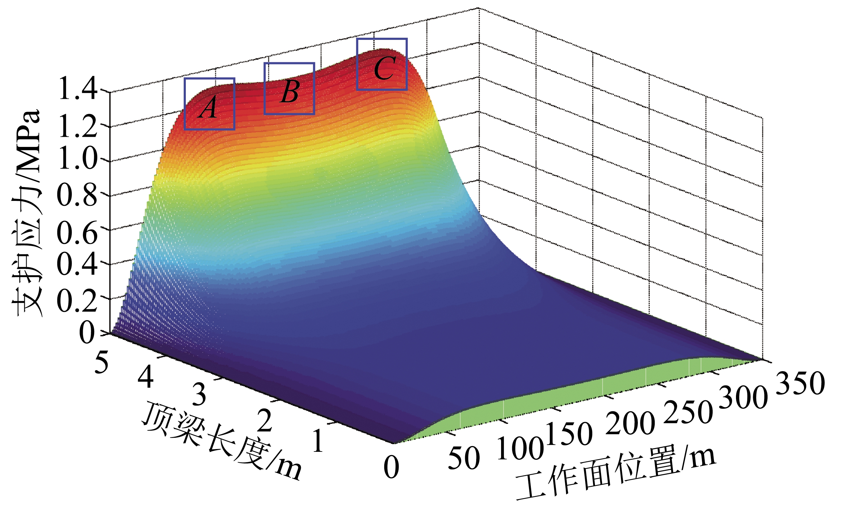 工作面三峰值“M”型分布特性不仅取决于工作面长度单一参数,而且还与埋深、采高、工作面长度、顶板岩性、基岩厚度、巷帮条件等诸多条件相关。哈拉沟煤矿工作面长度450 m时出现三峰值“M”型,口孜东煤矿5.5 m采高时350 m出现三峰值“M”型,而140502工作面在7 m采高时,工作面长度300 m就开始呈现三峰值“M”型分布特点。对深井厚煤层大采高综采工作面来说,必须要根据具体煤层赋存条件来确定工作面的合理长度。特别是对于那些埋藏深、采高大、基岩薄、煤层软、顶板破碎的深井工作面来说,更要充分考虑上述特点,以确定合理的工作面长度。