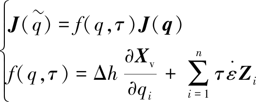 为雅可比矩阵修正式;f(q,τ)为修正函数;τ为机械臂运动速度限制;Xv为机械臂位移矢量;Δh为关节变化量;