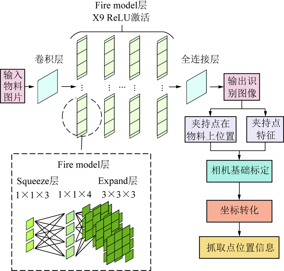 建立基于轻量级卷积神经网络(SqueezeNet网络)[43]的目标物料动态图像识别优化模型,优化SqueezeNet网络学习速度,提升长杆件目标物料等的识别速度,降低计算量和训练复杂度,提高长杆件目标物料的识别效率和精度。通过视觉系统采集物料的图像并输入优化SqueezeNet网络进行识别,解算出预设夹持点为特征和位置信息,结合视觉与机械臂末端坐标转换关系,获取机械臂抓取位置。