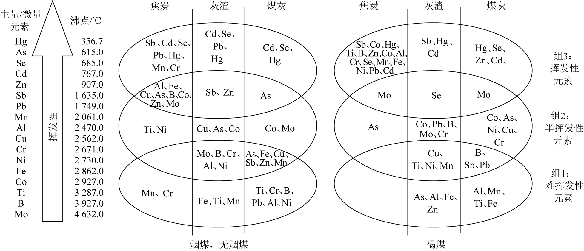 煤中微量元素可挥发性与其挥发温度(沸点)有关。根据沸点温度,煤中常见有害微量元素分为3类:易挥发性,如Hg、As、Cd、Pb等,沸点相对较低;中挥发性,如Cu、Cr、Ni等,沸点相对较高;难挥发性,如Co、Ti、Mo等,沸点极高(图2)。电厂炉前煤与炉渣样分析结果也显示,元素沸点越低,其燃烧挥发率越高[93]。