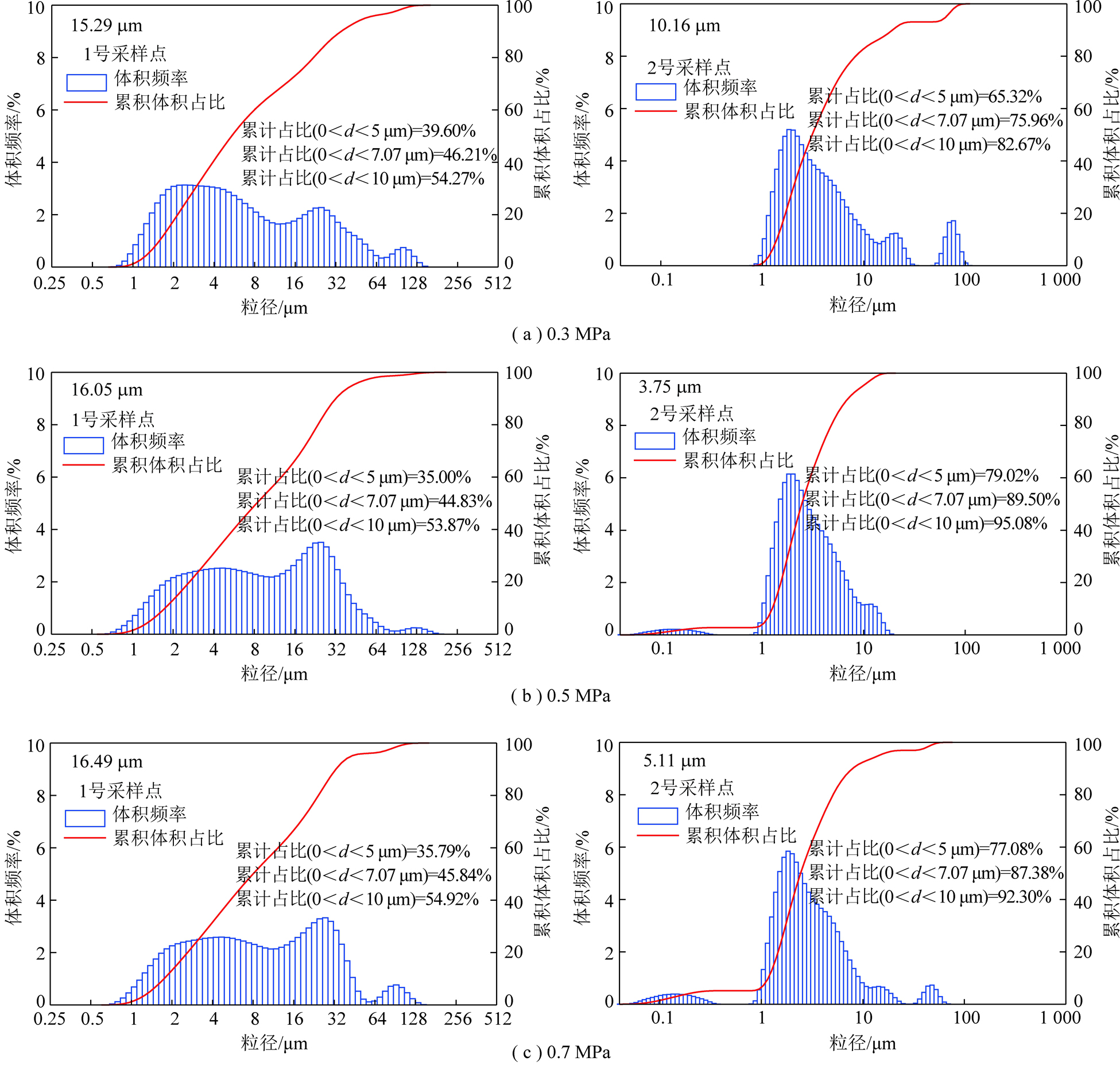为了进一步分析增大供水压力及弦栅表面改性后的呼吸性粉尘除尘效率,依次对图12的采样滤膜进行粒径分析,得到2个采样点的采样滤膜粒径分析如图13所示。