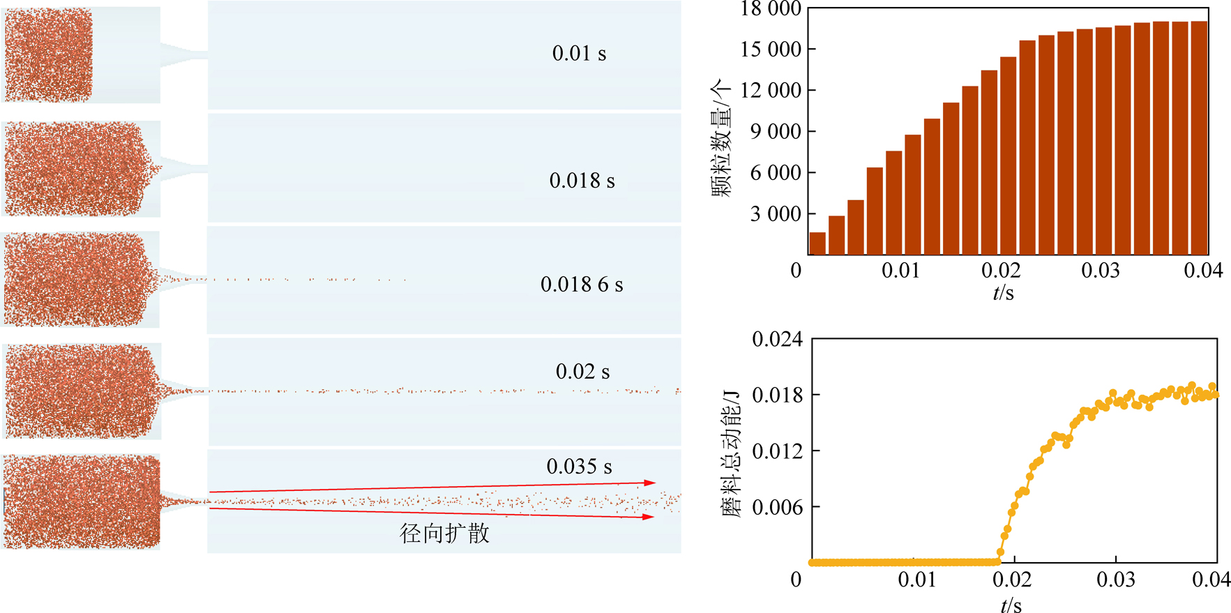按照上述设置条件进行数值模拟,得到了预混合磨料水射流运动过程。压力5 MPa、质量分数8%时不同时刻粒子的分布特征如图5所示。图5中,当时间0.001 s<t<0.018 s时,磨料粒子在管道内运动。当t>0.018 s,磨料粒子经喷嘴内部加速,运动至自由流场;在喷嘴附近,磨料集中在自由流场轴线附近,随着磨料颗粒向下游运动,磨料沿自由流场径向扩散。当t=0.035 s时,计算域内磨料粒子数量达到稳定,计算域内最终的粒子数量稳定在17 000个,计算域内磨料总动能趋于稳定。其余质量分数时磨料粒子稳定时间均在0.035 s左右,下面以t=0.04 s(计算域内粒子数量达到稳定后的时刻)为例,分析不同质量分数射流流场内磨料粒子的运动和分布规律。