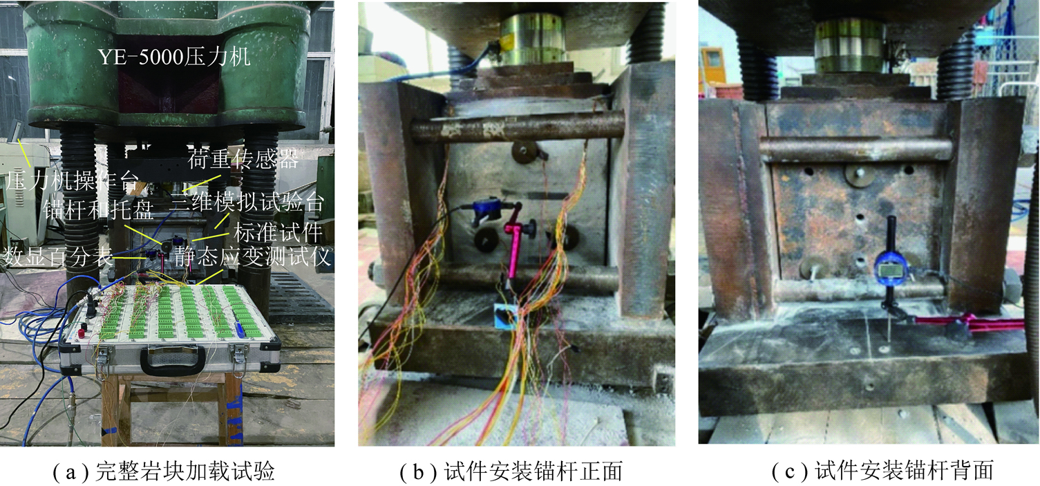 笔者前期已进行了预裂岩体加锚试验,预裂岩体制作方法如下:利用三轴加载相似模拟试验系统,通过压力机对试件施加竖向压力,然后利用竖向荷载引起试件侧向膨胀变形使得左右挡板对试件施加一对左右方向水平压力,另外在前部挡板表面通过千斤顶对试件前后方向施加荷载,这样就使得试件处于三向受力状态,在竖向荷载不断增大的过程中,水平荷载受到试件径向膨胀反作用力也在不断增大,待达到预定荷载后稳定一段时间,撤去试件前挡板压力,保持竖直方向持续加载,模拟巷道开挖卸荷过程,当竖向应力不再上升、试件进入峰后阶段停止加载,此时试件完成预裂。