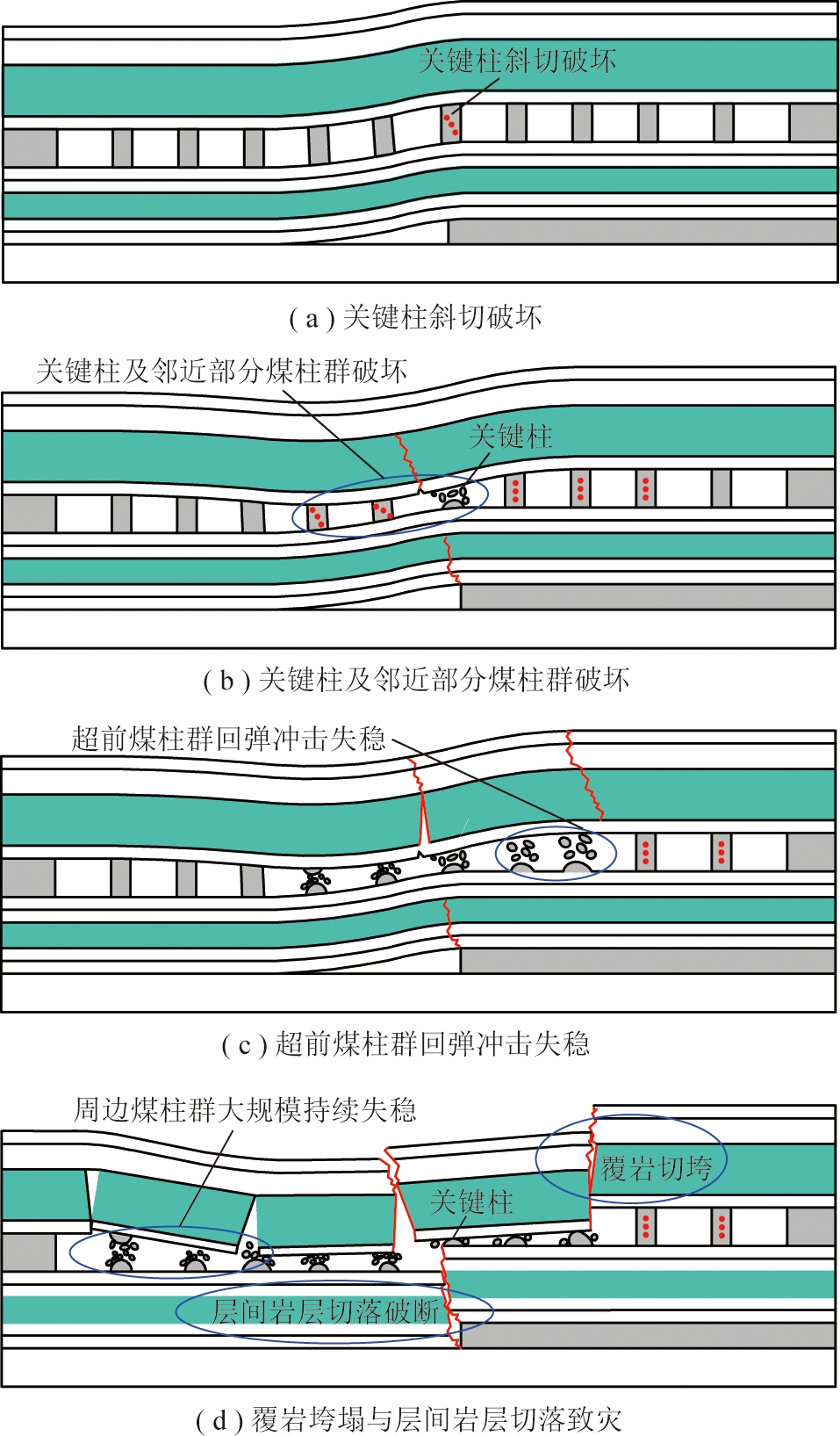 综上,采动影响下关键柱斜切破坏是诱发“煤柱群-覆岩”体系失稳破坏的源头,可以视为超前煤柱群失稳致灾的诱因。关键柱早期失稳后,会带动覆岩载荷转移,使得邻近部分煤柱群过载而发生斜切破坏。在此基础上,覆岩会逐渐发生超前破断与回转运动,进一步促进超前煤柱群的回弹变形与冲击失稳,并诱发覆岩的整体垮塌与层间岩层的切落破坏。