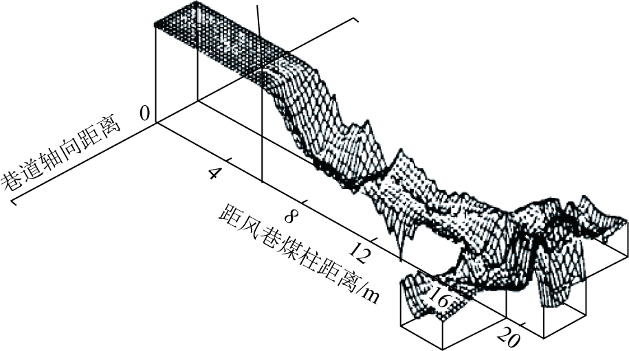 为了研究综放工作面的煤炭损失,1994年,潞安王庄矿在4318低位综放工作面穿过原回风巷煤柱向其采空区掘进了一条探测采空区残留煤炭的巷道,直观观测采空区的煤炭损失,探巷高度2 m。工作面长171 m,煤厚6.8 m,机采高度3 m,如图3所示,为采空区探巷观测到的残留煤炭分布,在风巷煤柱边缘平行工作面进入采空区,至煤柱6 m处开始见矸,说明在此之前残留煤炭厚度大于2 m,这也就构成了工作面端头的煤炭损失,继续进入采空区内部,残留煤炭分布趋于正常。采空区残留煤炭平均厚度为0.94 m,计算得到工作面采出率为86.18%[7]。这一工作的重要意义在于基本摸清了综放工作面采空区的煤炭损失分布,以及提高综放工作面采出率的努力方向。